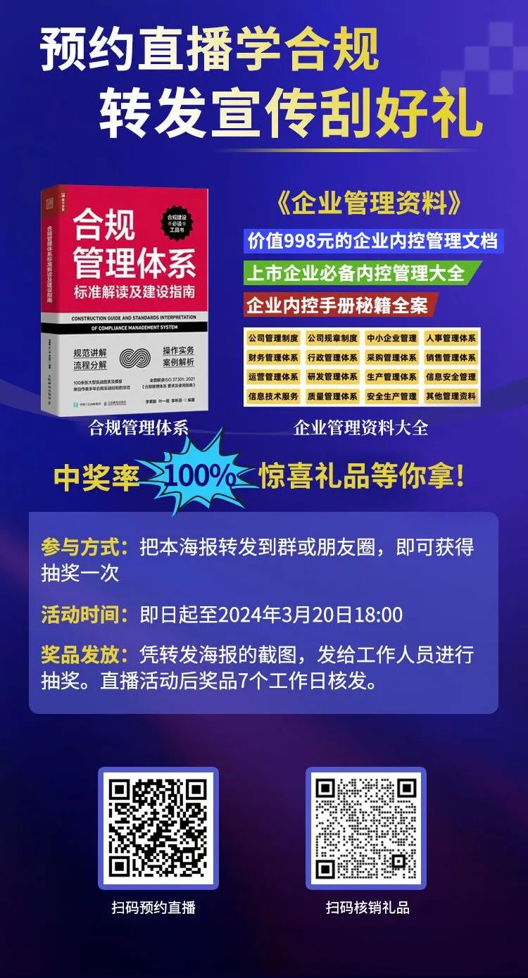 观看直播,不仅能够获得宝贵的知识和经验,还有机会参与“预约直播学合规,转发集赞刮刮乐”活动,100%中奖,获取行业合规经典书籍等丰富奖品!