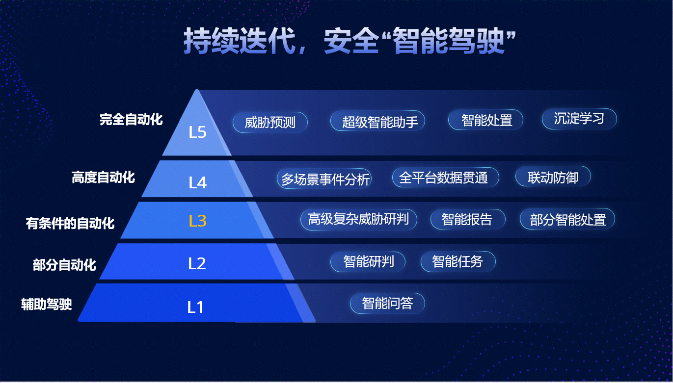 对于安全机器人的未来规划,张卓表示,从纵向看,目前我们已经处在“基本实现自动化”阶段,下一步将逐步进化到“高度自动化”,并最终向“完全自动化驾驶”方向迈进;而从横向来看,机器人在分析场景下,逐步从网络侧,向天眼、NGSOC、天擎、椒图等产品扩展,并覆盖客户全部的安全运营场景,向AI+全面加速。