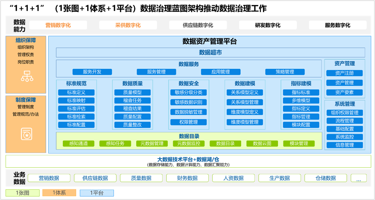 项目围绕“1+1+1”的数据治理架构,提高数据质量,实现广泛的数据共享,发挥数据价值。通过对某重卡企业的数据资源进行盘点,构建了以数据架构为核心,涵盖了资产目录、数据分布情况、数据标准以及企业级数据模型的数据治理“1”张图。基于数据治理能力要求,形成以组织保障、规章制度、管理流程为核心的贯穿数据全生命周期的数据治理“1”个体系。通过数据资产管理平台与企业大数据平台的拉通,打造数字化转型的核心引擎“1”个平台,增强了企业数据底座能力,实现数据开发治理一体化。