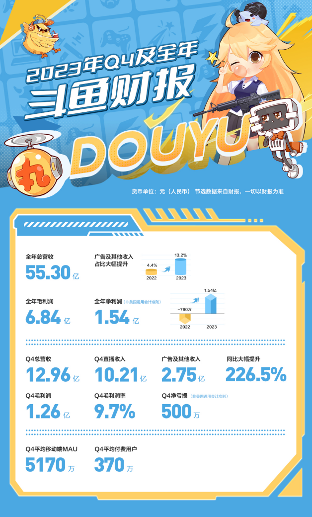 财报数据显示,2023年,斗鱼第四季度总营收12.96亿元,直播收入10.21亿元,广告及其他收入2.75亿元,同比大幅提升226.5%,毛利润1.26亿元,毛利率为9.7%,调整后净亏损为500万元。本季度移动端平均MAU为5170万,环比保持稳定,季度付费用户为370万。2023年全年,斗鱼总营收55.3亿元,毛利润6.84亿元,调整后净利润为1.54亿元,优化成本结构的平台举措成效初显,平台盈利效能获得有效提升,成功实现净利层面扭亏为盈。