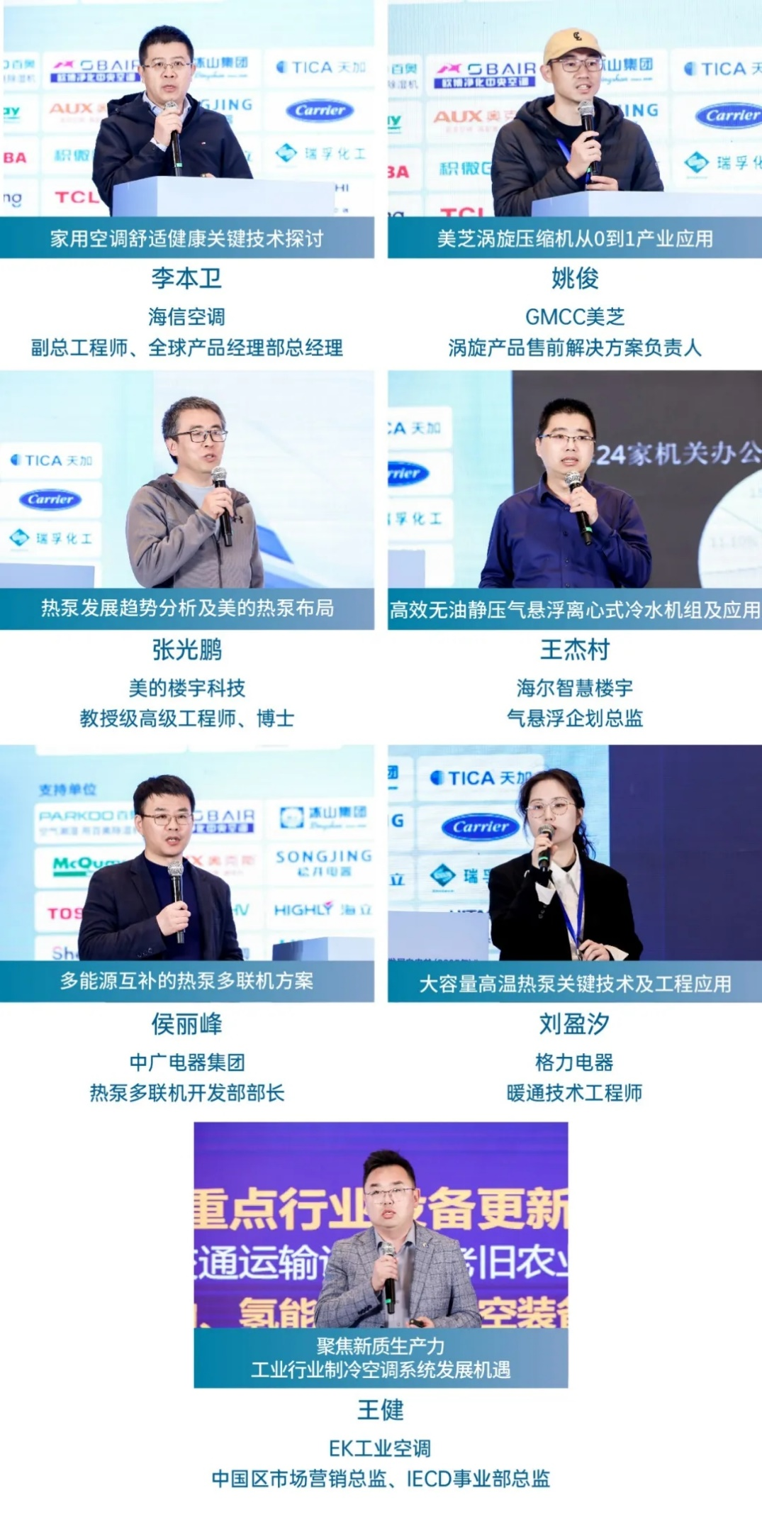 来自业内主流企业的技术专家们就各自领域的技术和产品方向进行了专业分享,他们分别是:海信空调副总工程师 全球产品经理部总经理李本卫、GMCC美芝涡旋产品售前解决方案负责人姚俊、美的楼宇科技教授级高级工程师 博士张光鹏、海尔智慧楼宇气悬浮企划总监王杰村、中广电器集团热泵多联机开发部部长侯丽峰、格力电器暖通技术工程师刘盈汐以及EK工业空调中国区市场营销总监 IECD事业部总监王健。
