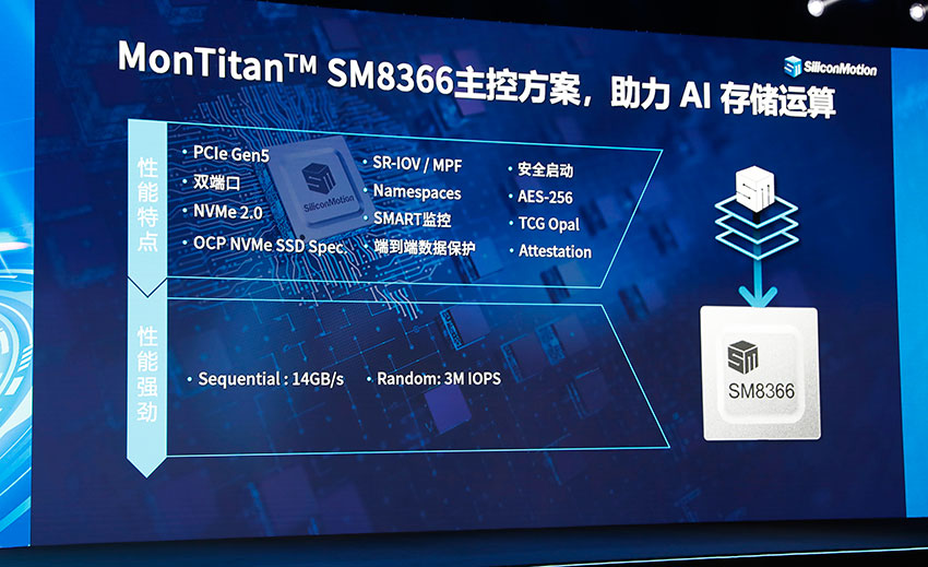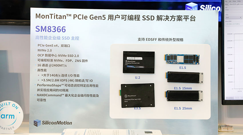 同时,慧荣展台现场工作人员还详细讲解了最新一代的可定制化编程式PCIeGen5 SSD解决方案平台——MonTitanTM。它是一款高性能、用户可编程的PCIeGen5平台,内置的就是这颗SM8366主控芯片。