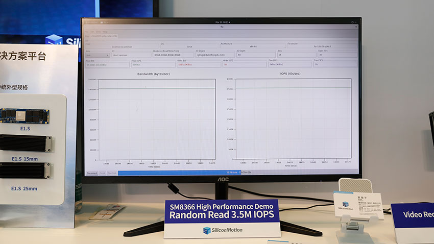 性能方面,我们在现场测试平台上也看到了SM8366主控芯片的真实状况,它能够提供高达14 GB/s的顺序读取性能和3.5M IOPS的随机读取能力,相比上一代接口提升相当明显,表现十分抢眼。