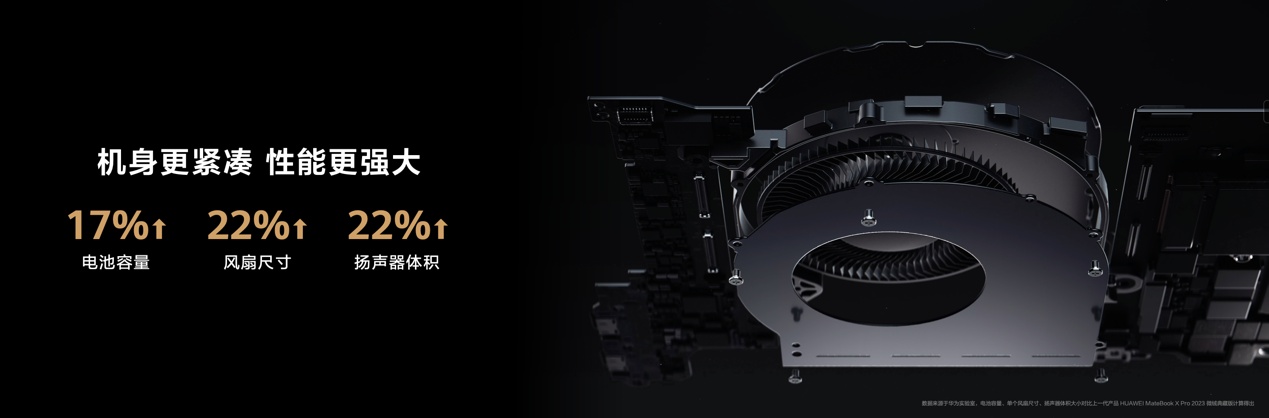 得益于云隼架构,华为MateBook X Pro的主板相比前代产品减重13%,内部空间占用降低8%,并且还提升了26%的堆叠密度。正因如此,华为MateBook X Pro才能完美容纳英特尔®酷睿™Ultra 9高性能处理器以及更大的风扇、更大的电池、更大的扬声器,为用户带来了更强的性能和更出众的产品体验。