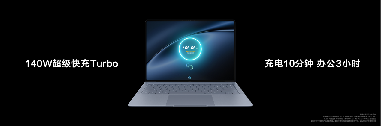 华为MateBook X Pro还创新地采用了双核充电专利技术,140W超级快充Turbo,充电10分钟,办公3小时。