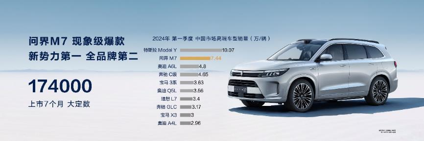 全场景智慧旗舰SUV问界M9上市短短三个月内累计大定突破7万辆,刷新国内50万元级别豪华汽车销售速度纪录。2024年第一季度,问界跻身中国市场豪华品牌销量前五,见证中国汽车豪华品牌新格局。