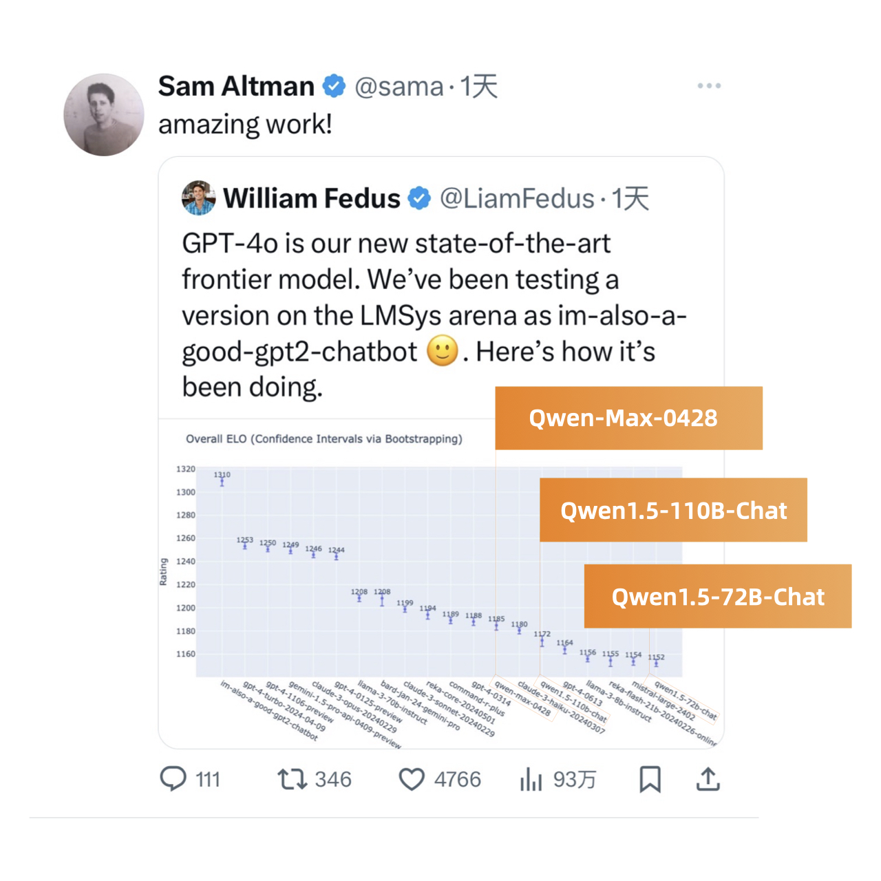 不久前,OpenAI的Sam Altman转发了Chatbot Arena榜单来印证GPT-4o的能力,其中全球排名前20的模型中,仅有的三款中国模型都是通义千问出品。