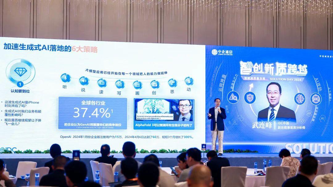 5月21日,由CIO时代、新基建创新研究院作为智库共同支持的中企通信“智创新·质跨越——Solution Day 2024”大会现场,IDC中国副总裁兼首席分析师武连峰作了“发展新质生产力,加速生成式AI落地”主题分享。