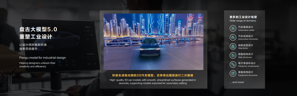 据介绍,在工业设计领域,以新车造型设计为例,周期一般需要1-2年,盘古大模型可以让汽车的造型设计时间大幅缩短。造型设计师可以将自己的灵感,通过对话、画图与大模型交互,生成3D汽车数字模型,并可进行风格化调整、零部件编辑、颜色更换等。盘古大模型生成的数字模型还可直接输出成3D文件,支持10几种主流格式,设计师可以直接3D打印成样品,减少制作油泥模型的轮次,极大地节省成本和时间。