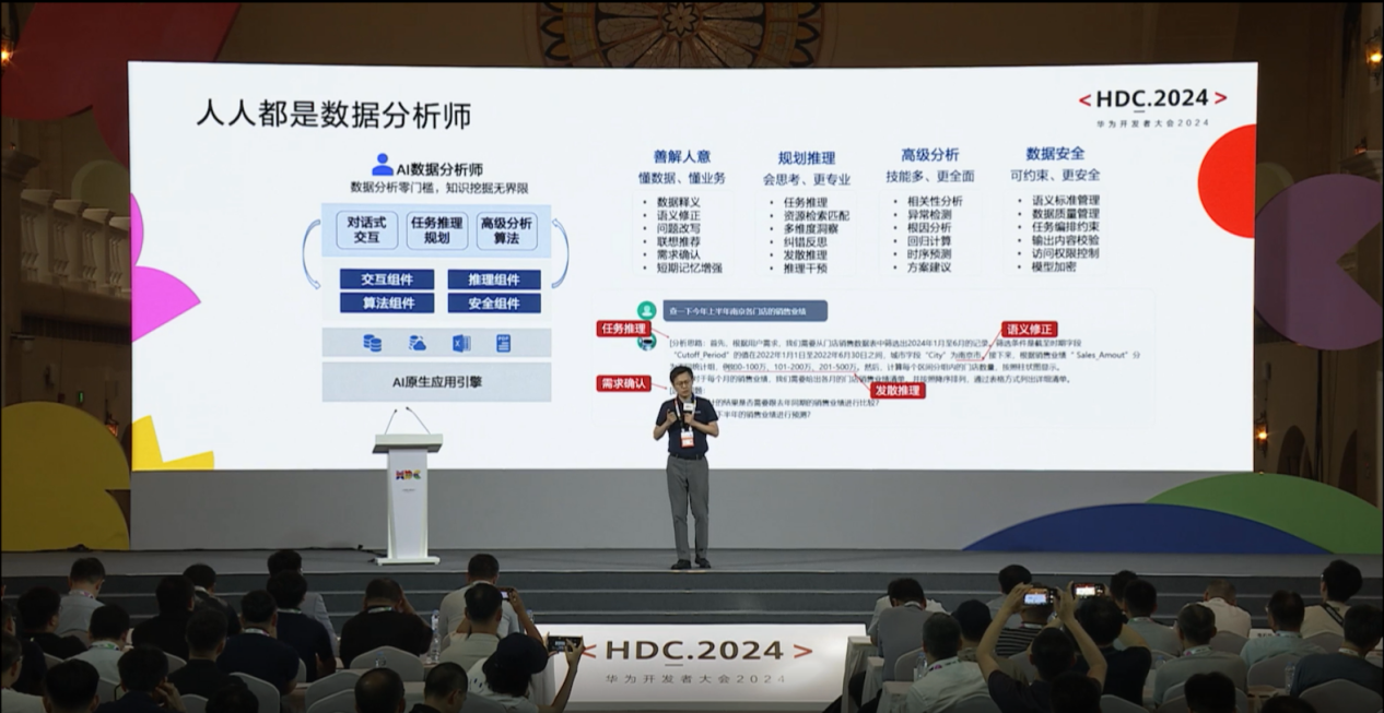 6月21日,在华为开发者大会2024上,盘古大模型5.0正式发布,在全系列、多模态、强思维三个方面带来全新升级,标志着华为云在人工智能领域再次迈出了坚实的步伐。6月22日,中软国际副总裁、AIGC研究院院长万如意博士受邀出席HDC 2024华为云开天aPaaS主办的《AI原生应用引擎,赋能AI应用创新,使能千行万业智能化转型》高峰论坛,分享了《拥抱AI原生应用引擎,构建问系列AI Agent产品联合解决方案》的主题演讲,并隆重发布了新产品——“AI数据分析师”。