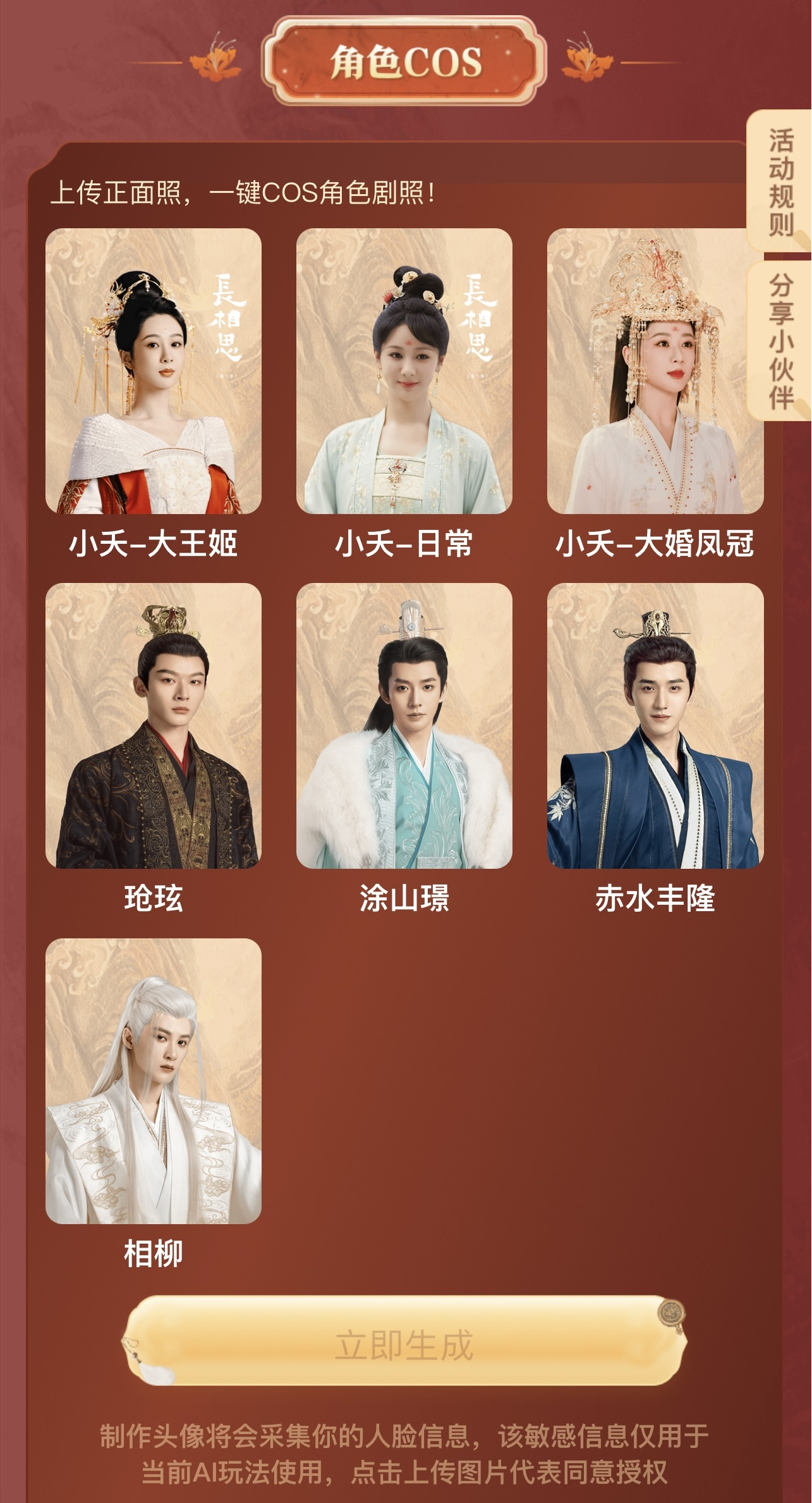 此外,基于图像融合生成等创新技术,元宝还基于《长相思》 经典剧照上线了“角色COS”玩法。用户上传照片后,即可免费生成人物同款剧照,还有“古风日常”、“大王姬”、“大婚凤冠”及男主同款等多种模板可供选择。