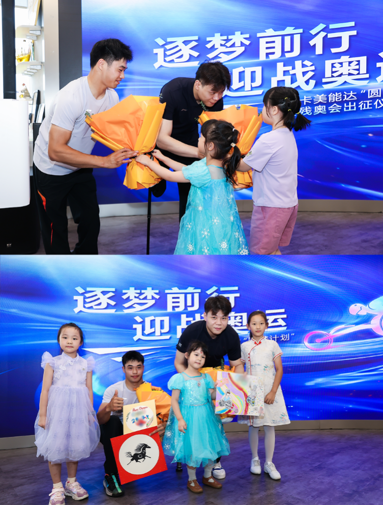 现场的小朋友们也都被王洋与李豪的运动精神所感染,纷纷登台献上鲜花以及亲手绘制的画作,向自己眼中的英雄表达了纯真的敬意与钦佩。