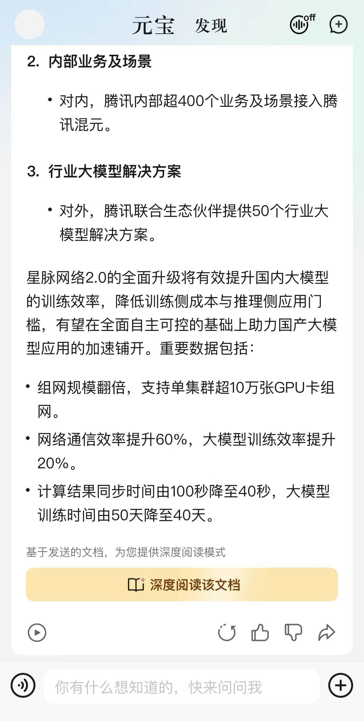 自发布起,腾讯元宝就针对AI辅助提效场景深度优化,提供“AI搜、读、写”的一站式服务,具备看、听、说等多模态交互能力。此前已支持 50 个各类型文件的批量泛读,具备图片、URL 链接等多格式解析能力,还可根据上传的文字及图片内容生成图表。