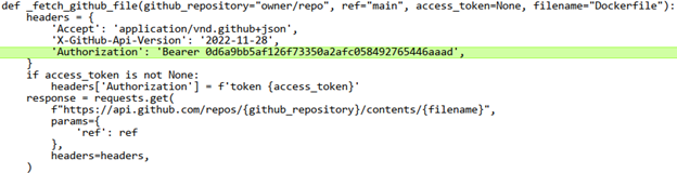 可以发现,尽管从 .pyc缓存文件中反编译的代码与原始代码相似,但其含有了一个包含有效GitHub令牌的授权数据头。