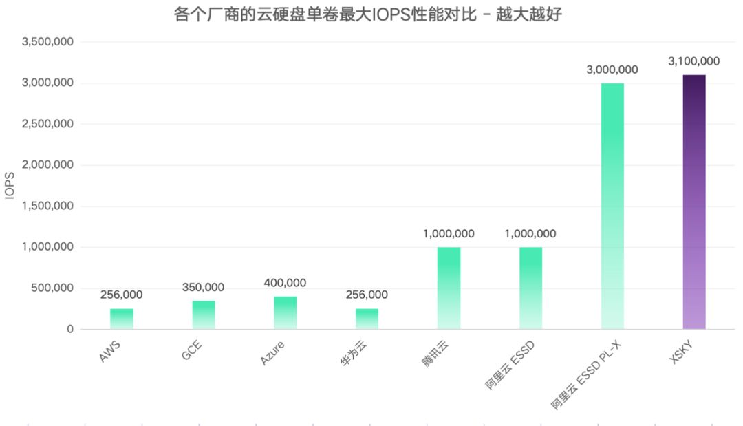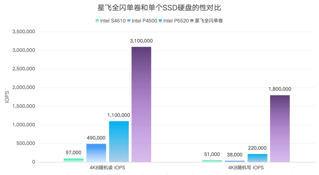 XSKY星辰天合近期正式公布了基于星海全共享架构的星飞全闪软件定义存储的最新性能,单个卷(LUN) 可达 310 万 IOPS ,领先全球范围的“云硬盘”。根据各厂商披露的公开数据,这一性能是华为云极速型 SSDV2 的 12.1 倍,是阿里云 ESSD 的 3.1 倍,也高于目前尚在邀测阶段、基于阿里云全新一代云盘架构的 ESSD PL-X 。