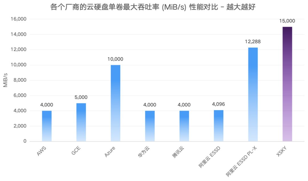 在吞吐率方面,星飞全闪同样表现优异,其单卷的最大吞吐率能够达到 15,000MiB/s,是华为云极速型 SSDV2 的 3.75 倍,是阿里云 ESSD 的 3.66 倍。