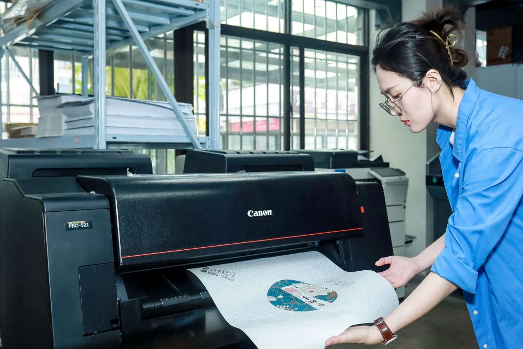 提及佳能打印机在绵纸打印上的表现,云鸿包装的负责人汤哲晶表示:“事实胜于雄辩,佳能imagePROGRAF-PRO系列和TM系列在绵纸打印上的稳定性与呈现效果,远远超出了我们的期待,它细腻地还原了设计稿的每一个色彩与细节,让传统文化元素在绵纸上焕发出新的生命力,成为了云鸿包装突破技术壁垒的得力助手。”这一变革不仅满足了客户日益增长的精细化定制需求,更彰显了云鸿包装在技术创新与品质追求上的不懈努力。