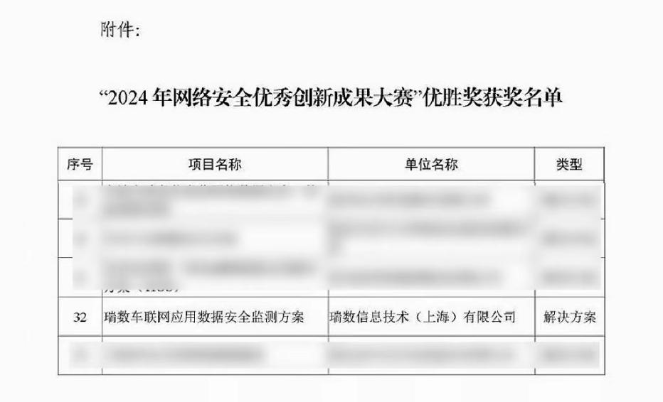 近日,CCIA中国网络安全产业联盟“2024年网络安全优秀创新成果大赛”评选结果正式公布。“瑞数车联网应用数据安全监测方案”凭借在网络安全领域的创新能力和产品成熟度,从众多参赛方案和产品中脱颖而出,荣获优胜奖!