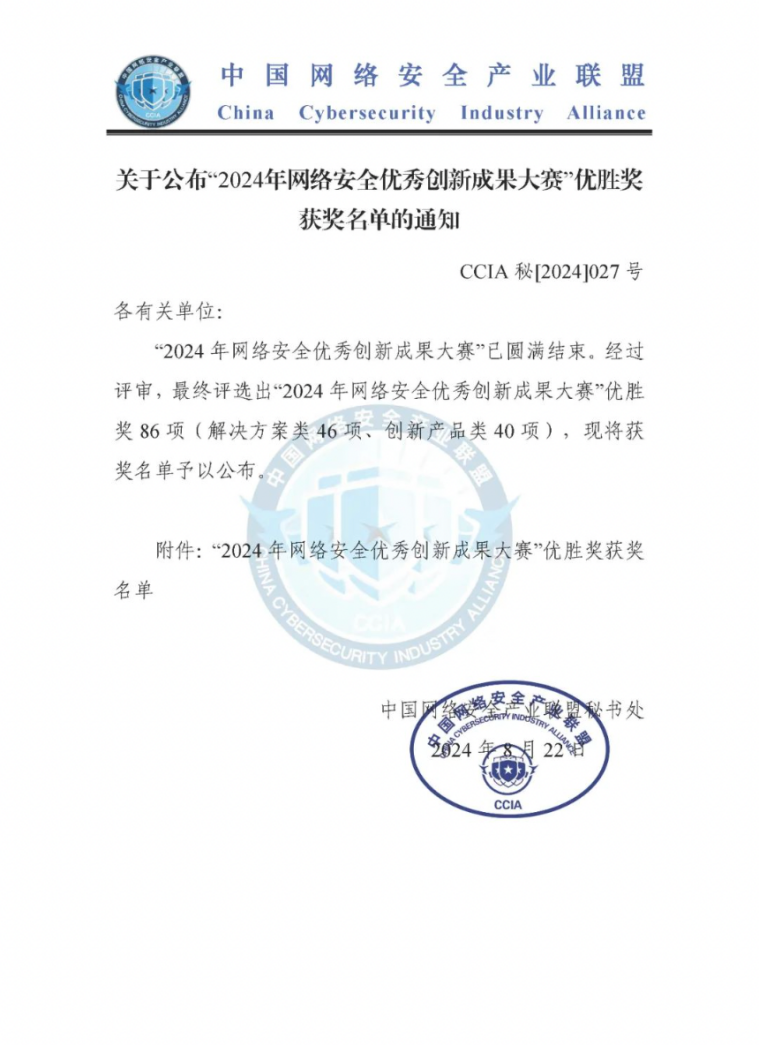 “2024 年网络安全优秀创新成果大赛”由中央网信办网络安全协调局指导,中国网络安全产业联盟(CCIA)牵头主办,旨在推选我国网络安全产业优秀创新成果,激发网络安全企业加强自主创新能力。大赛已经成为国内网络安全行业的一项重要标杆赛事,深受各地网信部门、政企单位以及网络安全企业的瞩目与认可。