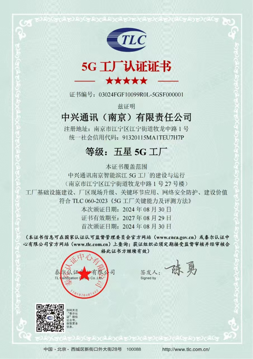 8月30日,中兴通讯南京智能滨江5G工厂(以下简称“滨江工厂”)正式通过中国信息通信研究院(简称“中国信通院”)泰尔认证中心评估,荣获国内首个五星5G工厂认证,成为5G技术与电子设备制造业深度融合与全面应用的新标杆。