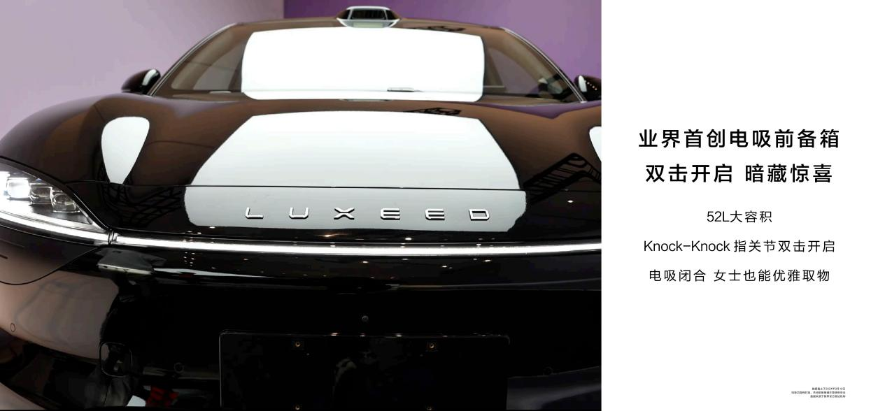 储物方面,智界R7拥有业界首创 Knock-Knock电吸前备箱,52L大容积,双击即开,电吸闭合,让用户取物更轻松优雅。
