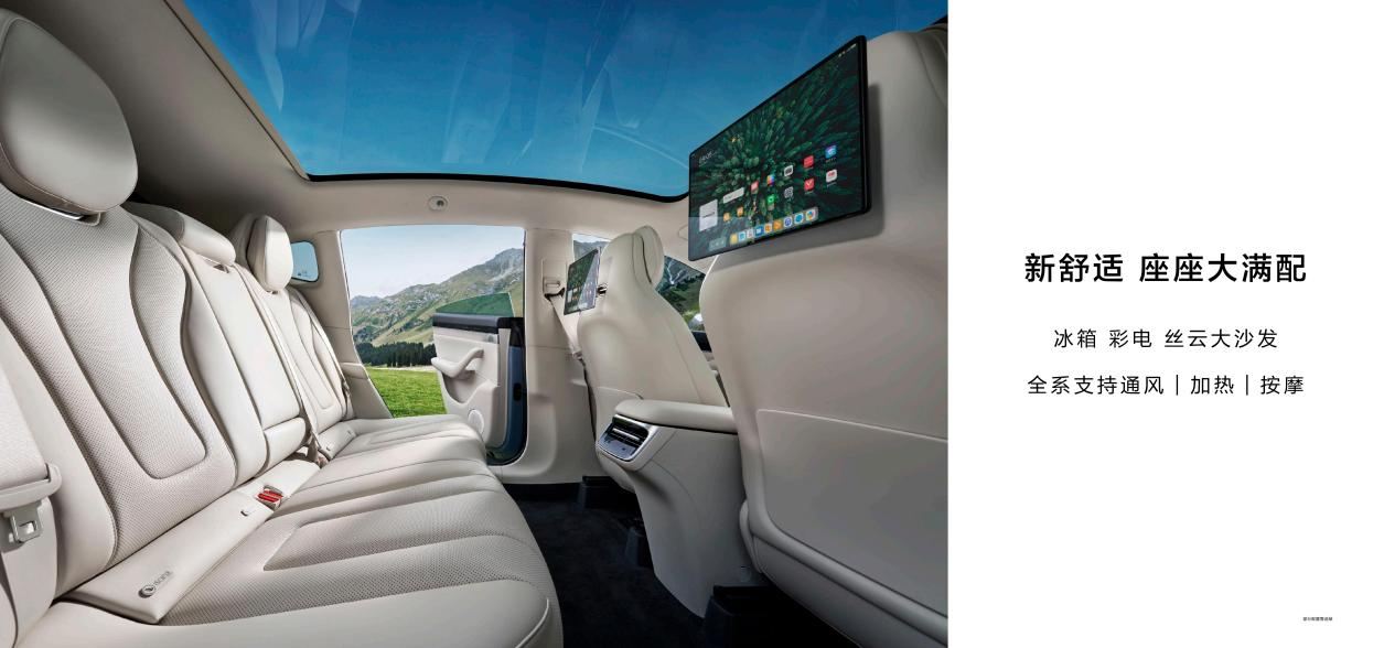 大空间更要有舒适大满配,智界R7车内“冰箱、彩电、大沙发”一应俱全。前排扶手箱处可选配8.2L冷暖箱Minibar,支持3°-50°超广温区调节,实现冷热饮料,畅享随心。后排HUAWEI Maglink联动智能平板,可让每个座位都有彩电。车内还配置丝云座椅,支持通风、加热、按摩。