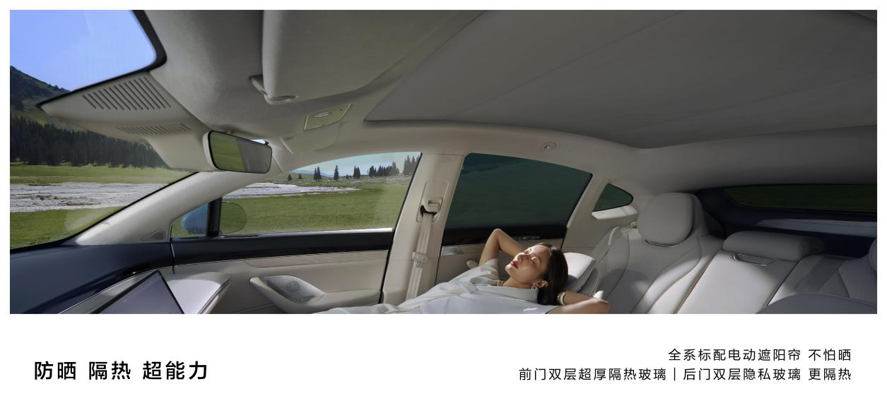 此外,智界R7还具有防晒、隔热“超能力”——前门车窗采用双层超厚隔热玻璃、后门车窗采用双层隐私玻璃,更隔热、更安静、更私密。全景大天幕搭配电动遮阳帘,既能拥有通透空间感,又能实现100%物理防晒,豪华舒适更进一步。