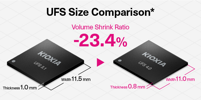 UFS 4.0的小封装尺寸也意味着允许手机、平板、掌机腾出更多的内部空间安装电池,可以进行更多的个性化设计,增加产品竞争力。以铠侠UFS 4.0产品为例,可以做到体积相对上一代UFS 3.1缩小23.4%,给未来的产品设计提升留足了空间。