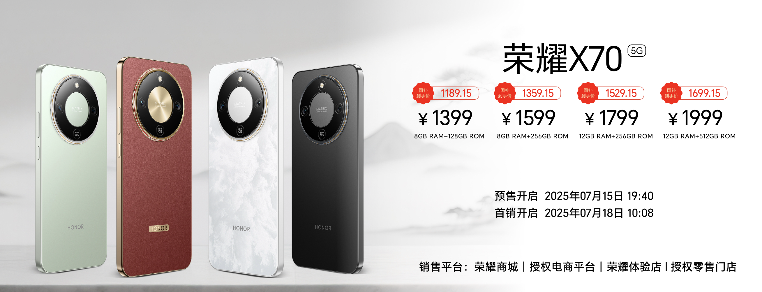 通信上支持5G双卡双待双通,搭配立体双扬、红外遥控、全场景NFC及双频GPS+三频北斗,实现全场景智能连接。价格与发售:1399元起,7月18日正式开卖荣耀X70提供朱砂红、竹韵青、月影白、幻夜黑四款国风配色,8GB+128GB版本首销价1399元起,叠加国补后最低1189.15元。目前已开启预售,7月18日10:08将在荣耀商城、授权电商及线下门店全面开售。