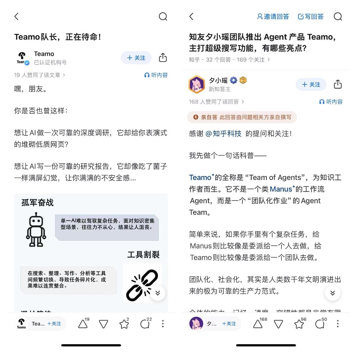 知乎不仅是产品的宣发平台,更是AI产品验证和共创的社区土壤。6月11日,知乎新知答主、AI Agent创业者夕小瑶在知乎首发全球首个多Agent协作的AI生产力平台Teamo,并邀请知乎用户内测。产品获得了众多专业答主的建议与改进意见。知乎由此成为Teamo产品声量发酵的起点,也促成了用户和开发者的真正持续对话。