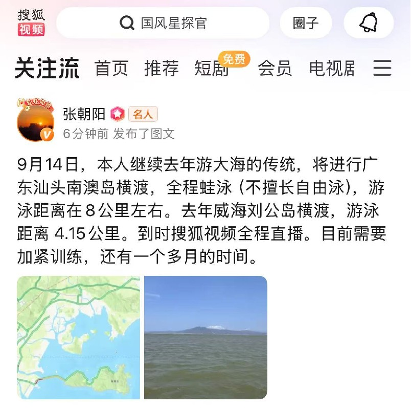 (张朝阳在搜狐视频“关注流”中官宣跨海挑战)