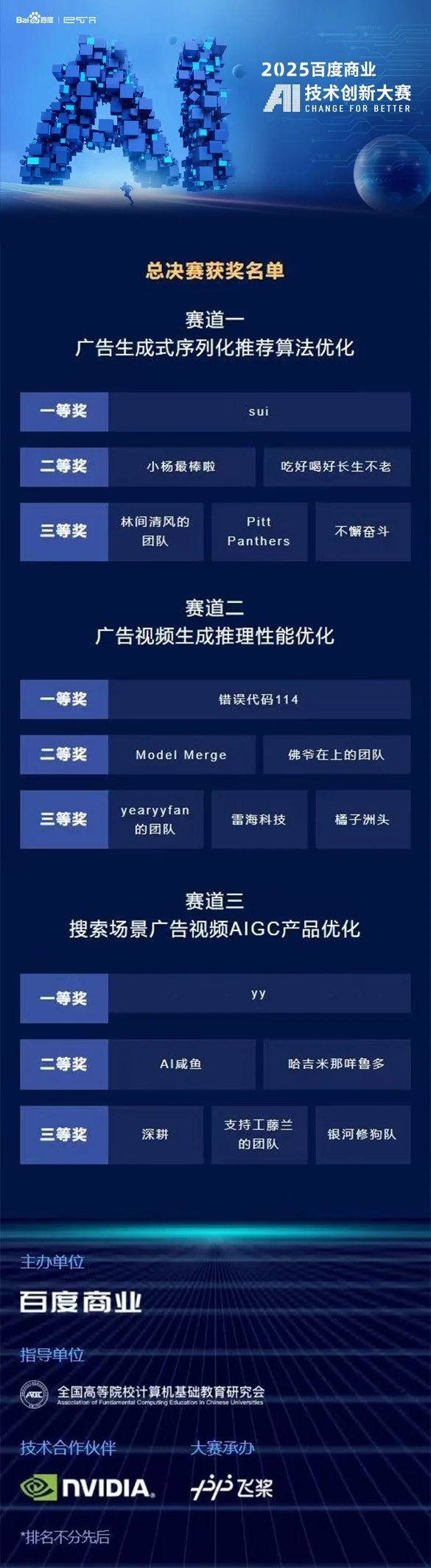 这届大赛共集结了来自海内外2500多支队伍参与其中,收集参赛作品近600件。经过四个月的激烈角逐,围绕「广告生成式序列化推荐算法优化」、「广告视频生成推理性能优化」、「搜索场景广告视频AIGC产品优化」三大赛道,最终18支队伍在决赛巅峰对决,通过项目展示与现场答辩⻆逐最终奖项,随着大赛圆满收官,获奖名单正式揭晓!