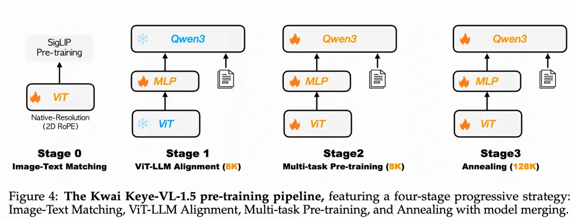 Keye-VL-1.5采用四阶段渐进式训练流水线,以系统化方式提升模型性能。首先,在视觉编码器预训练阶段,使用SigLIP-400M权重初始化ViT,并通过SigLIP对比损失持续预训练以适应内部数据分布。第一阶段重点优化投影MLP层,实现跨模态特征的稳固对齐;第二阶段解冻全部参数进行端到端多任务预训练,显著增强基础视觉理解能力;第三阶段进行退火训练,利用高质量数据微调模型,弥补上一阶段中高质量样本接触不足的问题,同时将序列长度扩展至128K、调整RoPE逆频率配置,并引入长视频、长文本和大尺度图像等长上下文数据。