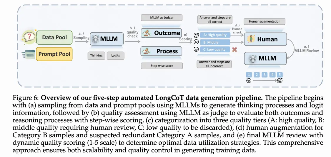 Keye-VL-1.5构建了一套系统化的后训练流程,包含四个核心阶段:监督微调与多偏好优化、长链思维冷启动、迭代通用强化学习以及对齐强化学习。该流程进一步融合了由快手Keye团队提出的五步自动化数据构建流水线,并依托GSPO算法对通用强化学习与对齐阶段进行迭代优化,显著增强了模型的推理能力,同时更好地与人类偏好实现对齐。