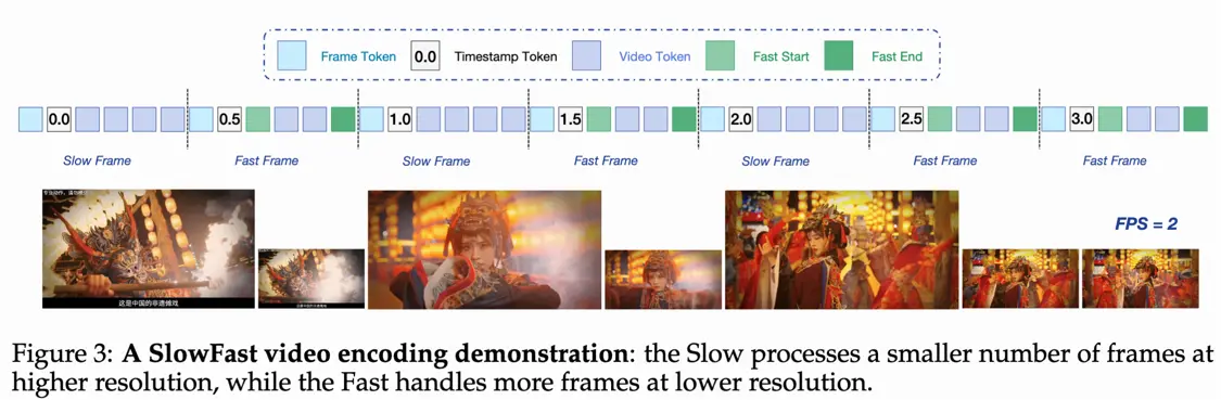 为了在短视频理解任务中同时实现高准确性与高效率。Keye-VL-1.5 创新性地提出了慢快编码策略 (slow-fast),该策略设置慢通路处理快速变化帧(低帧数-高分辨率),快通路处理静态帧(高帧数-低分辨率),从而在节省计算资源的同时保留关键信息。