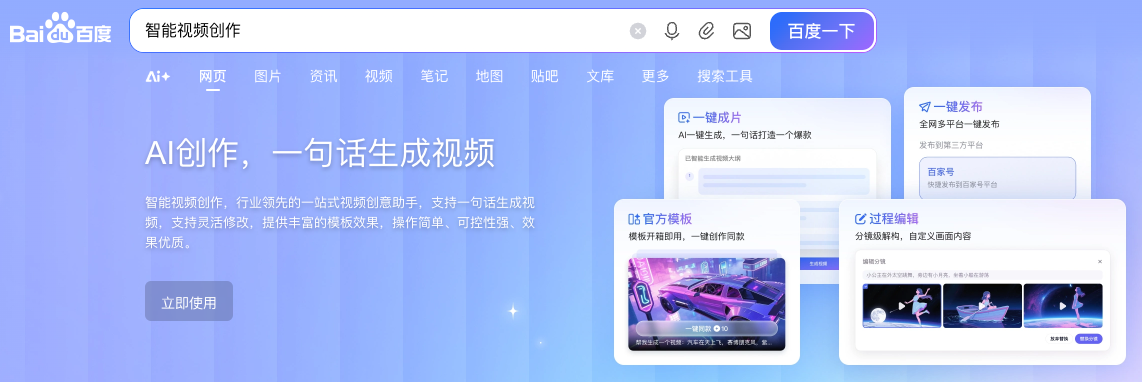 据悉,百度搜索今年7月便聚焦AI视频能力研发,正式上线了百度AI智能创作工具。用户只需要在百度搜索「智能视频创作」,便可一句话生成视频,实现一站式自动生成剧本、拆解分镜、生成分镜图及视频的丝滑创作体验。同时,还支持参考图片与视频素材制作剧情故事、营销短片等内容。