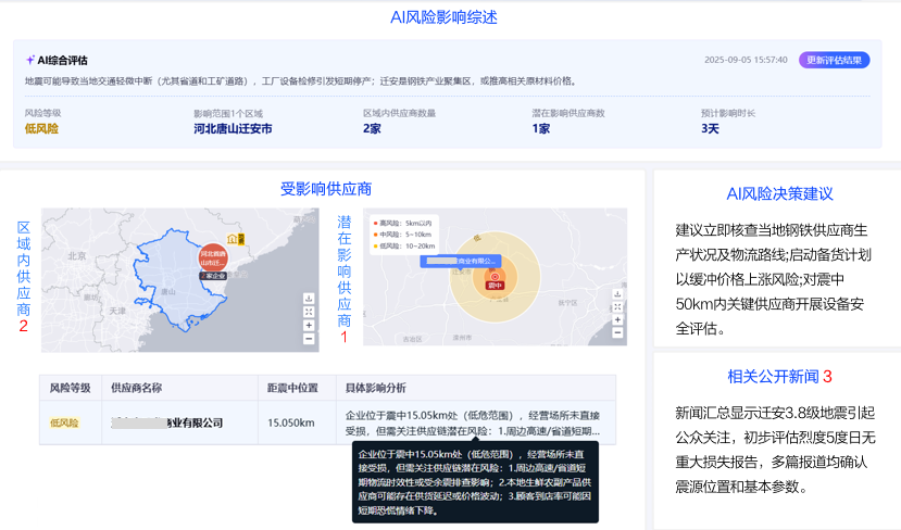 以地震风险为例,启信慧眼能够实时推送震中、震级、受影响供应商等关键信息,标出预计影响时长,并结合历史地震数据与专业评估模型,预测对供应链的潜在冲击,给出具体决策建议。比如某地发生3.8级地震,AI会综合多维度信息进行风险评级,明确标注出“两家供应商受影响、预计影响时间3天”等重要信息,同时给出企业应立即核查当地供应商生产及物流路线、启动备货计划以缓冲价格上涨风险、对震中50km内关键供应商开展设备安全评估等决策建议。