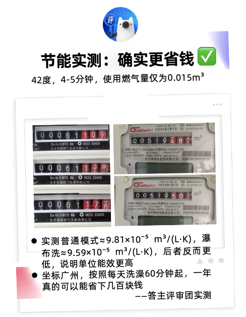 在测试相同出水温度(40℃)下热水器的单位能耗时,多名答主采用燃气表+流量计组合的专业测量方法,得出令人惊讶的结论:瀑布洗模式,尽管提供了更大的水流量,但其单位能效竟然优于普通模式。