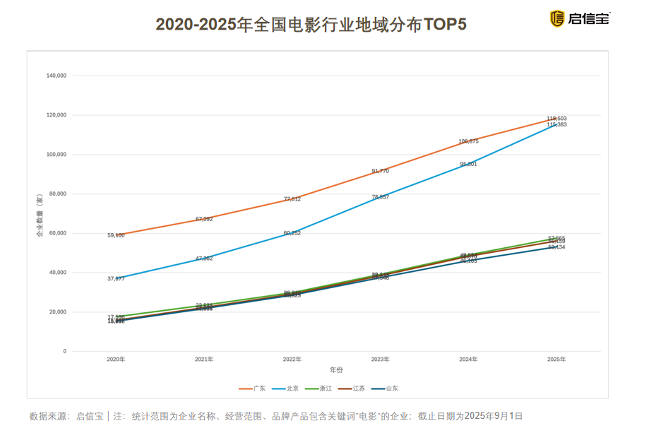 有趣的是,广东不仅是“最能花钱”的观影大省,也是影视业的创业热土。据启信宝统计,截至2025年9月,全国1.91万家影院相关企业中,有17%“落户”广东,总量达3233家。在全国电影相关企业数量分布中,广东更是以11.8万家高居榜首,与拥有11.5万家企业、位列第二的北京共同占据全国近四分之一的市场份额。浙江、江苏和山东则分别以5.7万、5.6万和5.3万家的规模排在第三至第五位。