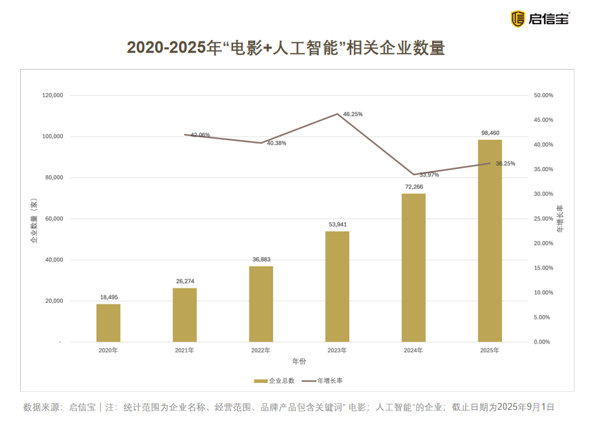为应对市场变化,降本增效和创造新体验正在成为行业刚需,AI技术由此加速渗透。启信宝数据显示,截至2025年9月,我国经营范围包含“电影、人工智能”的企业总数已超过9.8万家,相比于2020年的1.8万家,6年内增长432.36%,增速高于行业整体水平。