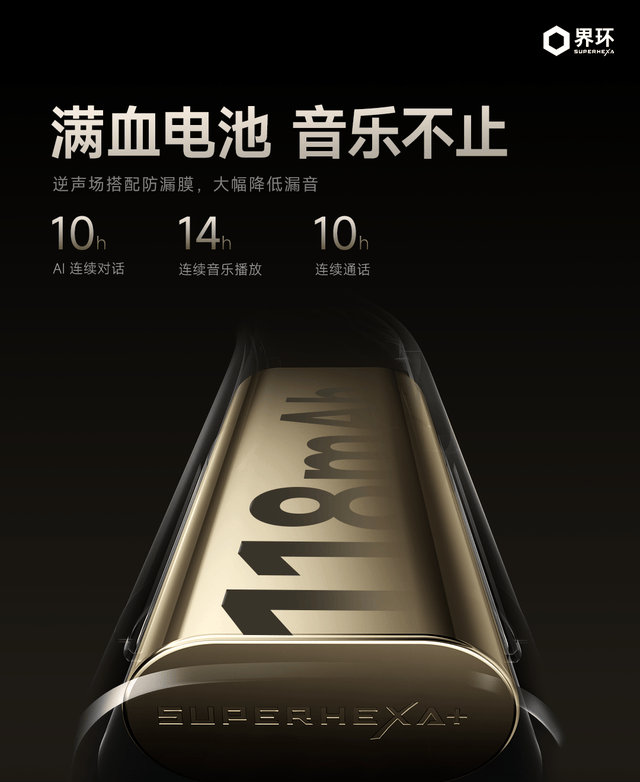 在续航方面,它搭载 Superhexa+ 定制激光非同轴钢壳电池,容量达 118mAh,比同级产品电量提升约 10%。特别版单次充满可支持 14 小时音乐播放、10 小时通话或 AI 连续对话,充分满足用户日常长时间使用需求。