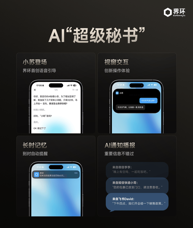 界环首创的 “小苏登场”,可以通过语音引导与手机界面联动,极大降低了使用门槛,让 AI 交互更自然、有温度VUI 2.0系统支持连续对话,无需反复唤醒,并通过悬浮窗(Android)与灵动岛(iOS)实现可视化反馈,让 AI 互动更加直观。同时,配合长时记忆与语音提醒功能,可帮助用户在忙碌中轻松管理工作与生活信息。