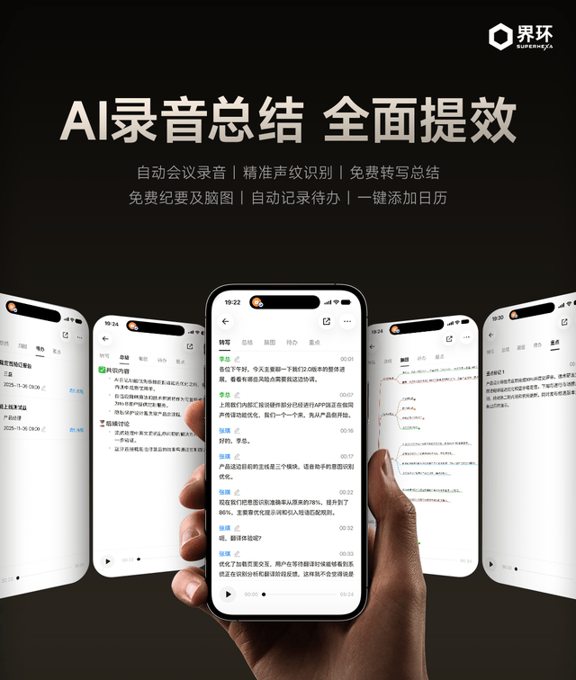 在功能层面,界环AI音频眼镜特别版将“全场景录音转写总结”与“跨应用AI实时翻译”两大核心AI功能全部免费开放,打破了行业内的订阅壁垒。录音转写功能支持多语种、多人区分发言,且能在会后自动提炼会议要点,生成纪要、脑图与待办事项,并可一键同步至日历,大幅提升办公与学习效率。