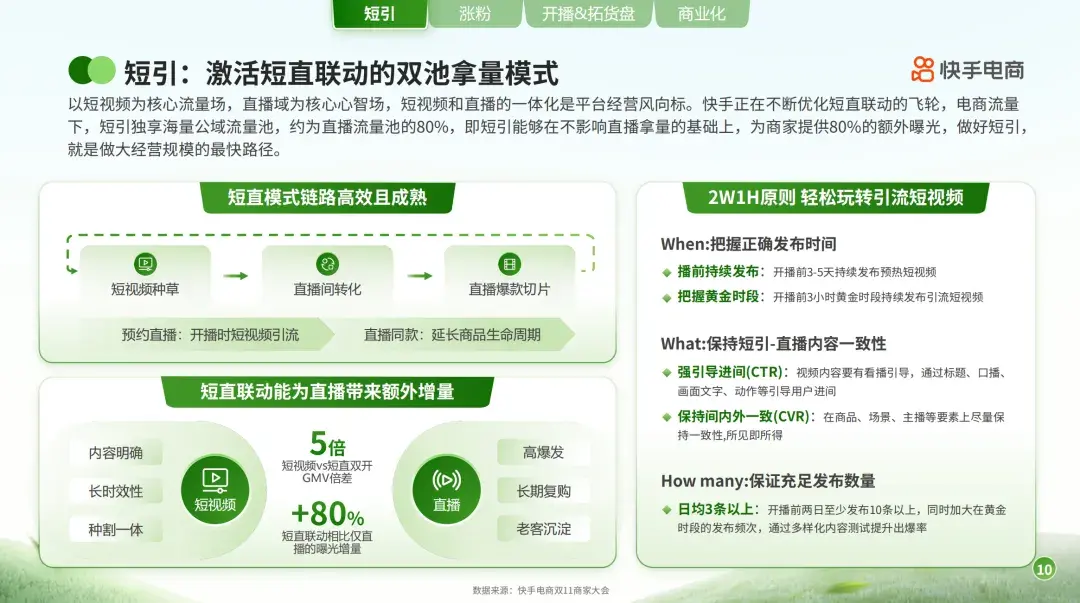 在快手电商高效且成熟的短直模式链路下,短直联动模式相比仅直播能够为商家带来80%的额外曝光增量,做好短引成为私域主播做大经营规模的最快路径。主播可以通过“2W1H”原则,即把握正确发布时间、保持短引-直播内容一致性和保证充足发布数量,轻松玩转短引,激活短直联动的双池拿量模式,实现流量爆发和经营跃迁。