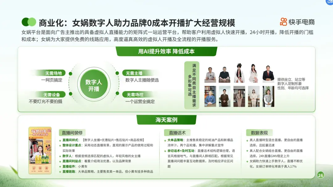 在此基础上,快手进一步为品牌商家提供了商业化产品、扶持政策等多维赋能。产品端,快手推出具备虚拟人直播能力的矩阵式一站运营平台“女娲数字人”,通过快速开播、24小时不停播,大幅降低开播门槛和成本。该平台还提供免费的线路应用、高度逼真的虚拟人开播及全流程的开播服务,帮助商家实现直播效率和GMV双升。