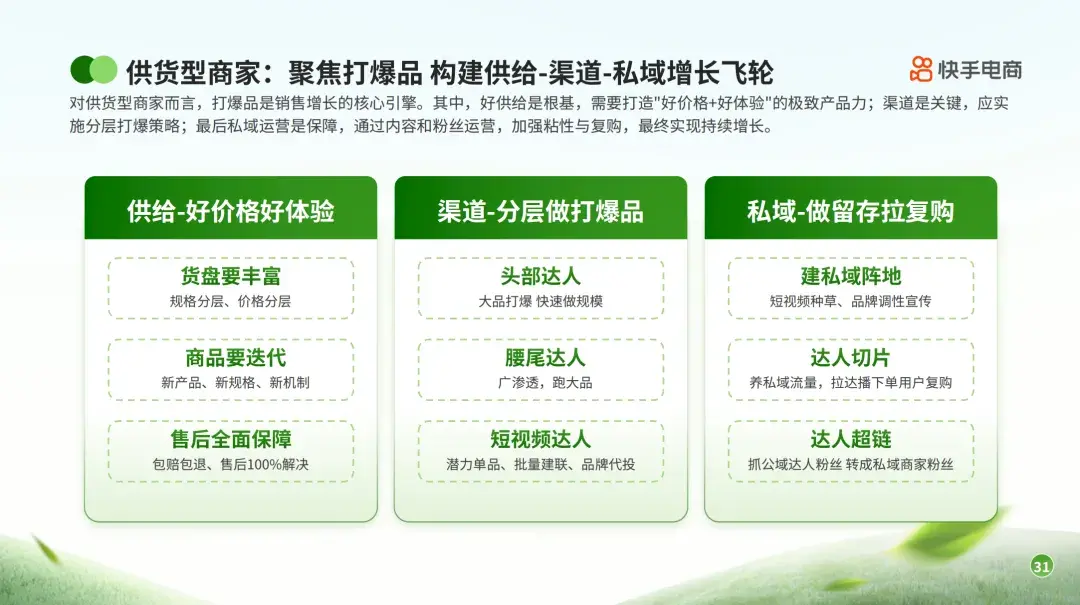 商品经营方面,爆品驱动品牌持续增长,实现更大的生意规模、更持久的商品留存。聚焦打爆品,品牌商家不仅可以重点提升爆品储备、做好商品卡运营、参与超级链接和大牌大补等平台爆品玩法,还可以构建多元化分销矩阵,实现爆品高效转化。同时,快手电商也提供了不同层级的达人匹配策略,以及民生专项、宝藏品牌发光计划等分销专项,为品牌商品打爆保驾护航。