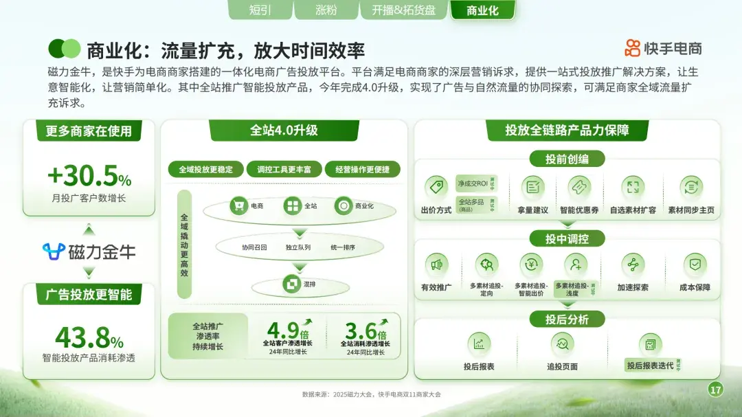在做好内容和商品经营的同时,品牌商家依托“磁力方舟、品聚招商、磁力金牛”三位一体营销体系,可以构建起从流量到销量的高效闭环,通过营销科学、创新玩法、投放产品,实现做大R3人群、全方位种草和大小场阶梯式爆发,不断突破品牌增长天花板。