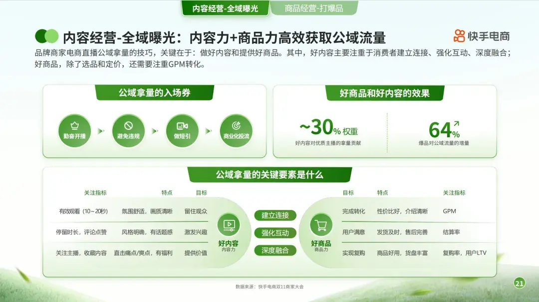内容经营方面,品牌商家高效获取公域流量的关键在于内容力和商品力,好内容和好商品可以帮助品牌与消费者建立连接、强化互动、深度融合,其中内容场的持续产出更是品牌激活全域曝光的基础。品牌商家掌握“创造用户和作者深度互动的机会、聚焦垂类创造、持续产出优质作品、准确挂载话题”四大流量密码,可以精准触达目标用户,驱动全域流量长效增长。