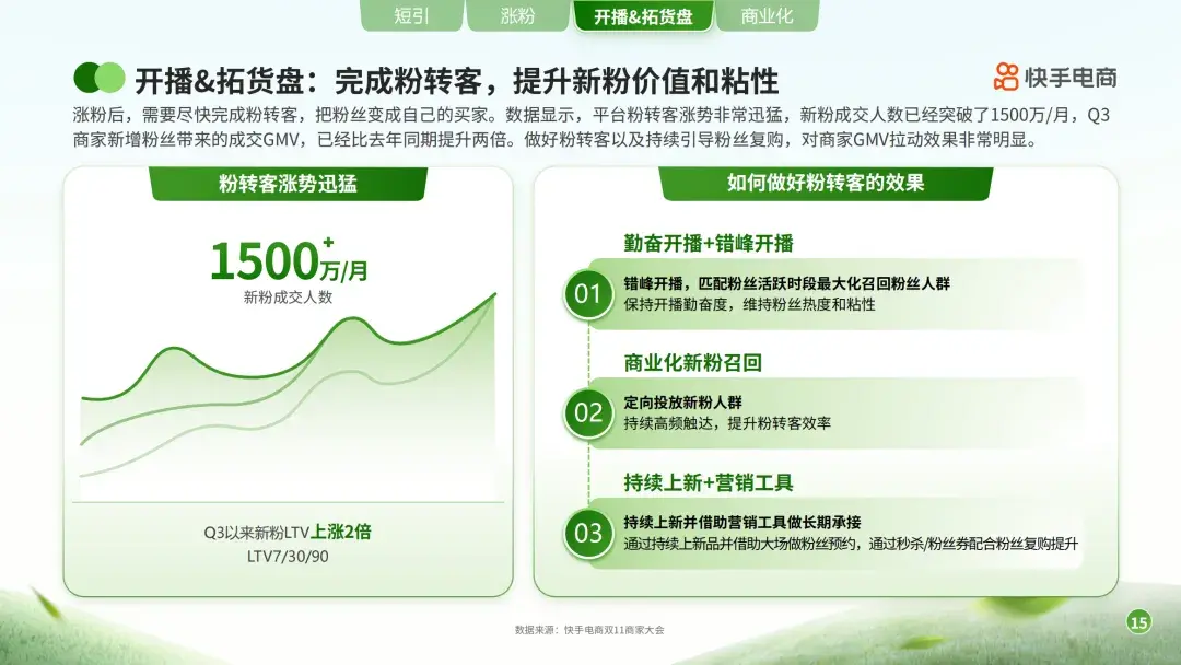 涨粉后,商家需要尽快完成粉转客,并提升新粉粘性、引导粉丝复购,进而拉动GMV增长。数据显示,快手平台粉转客涨势迅猛,新粉成交人数突破1500万/月,2025年Q3商家新增粉丝带来的成交GMV同比增长2倍。依托勤奋开播+错峰开播、商业化新粉召回、持续上新拓货盘+营销工具等策略,私域主播能够实现更好的粉转客效果。