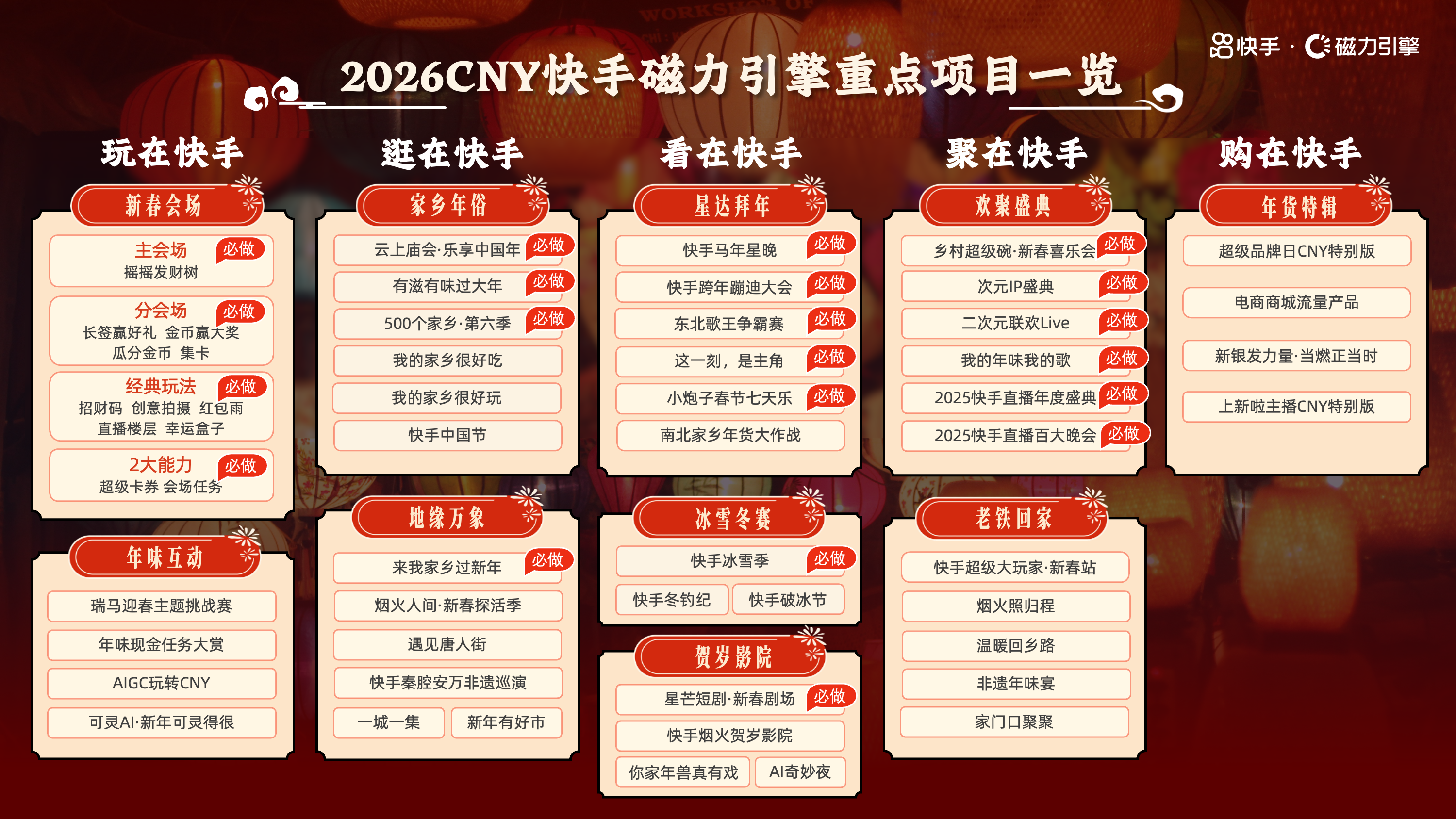 面对即将到来的马年春节,快手带来鲜活滚烫的“新年味”,营造“玩、逛、看、聚、购”在快手的浓郁年味氛围,打造线上线下同频共振的超级营销矩阵,携手更多品牌,与老铁一起奔赴温暖、热闹的2026年新春。